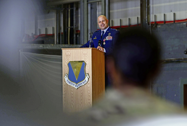 U.S. Air Force Lt. Col. Micah Neece, 86th Comptroller Squadron outgoing commander, gives remarks during the 86th CPTS change of command ceremony at Ramstein Air Base, June 28. Neece will be moving on to his next assignment as a financial management officer at the Pentagon, Washington, D.C.