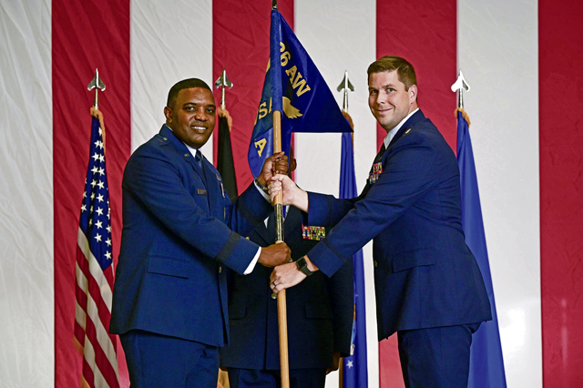 U.S. Air Force Brig. Gen. Otis C. Jones, 86th Airlift Wing commander, left, passes a guidon to Maj. Joshua Mann, 86th Comptroller Squadron incoming commander, at Ramstein Air Base, June 28. Prior to being stationed at Ramstein Air Base, Mann was an intermediate developmental education student at the 38th Student Squadron at Maxwell Air Force Base, Alabama.