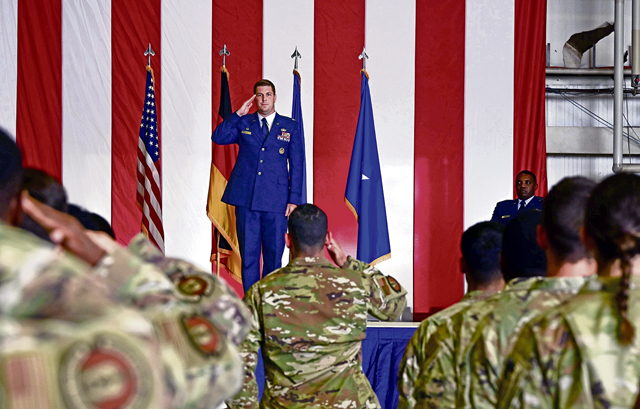 U.S. Air Force Maj. Joshua Mann, 86th Comptroller Squadron commander, renders his first salute during a change of command ceremony at Ramstein Air Base, June 28. The Airmen assigned to the 86th CPTS rendered their salute as a welcome to Mann as their new squadron commander.