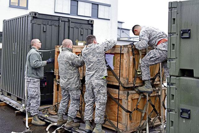 An Airman assigned to the 86th Logistics Readiness Group secures a chain to lock a pallet in place as part of a mobility exercise Jan. 26 on Ramstein Air Base. Exercises like this are scheduled to be performed twice a year with eventual inclusion of other units besides the 86th Airlift Wing.