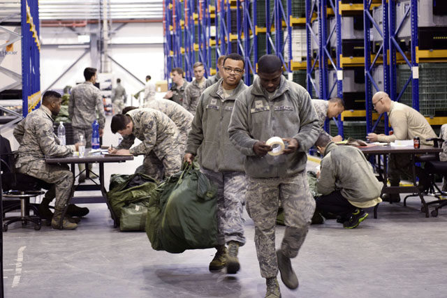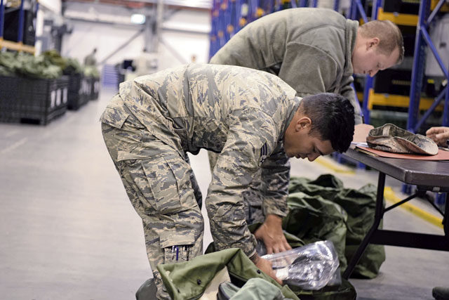 Airmen assigned to the 86th Logistics Readiness Group check duffel bags to ensure all of their individual protection equipment is accounted for Jan. 26 on Ramstein Air Base. The 86th LRG began their mobility exercise in the early morning at 5 a.m. and ended at 5 p.m.