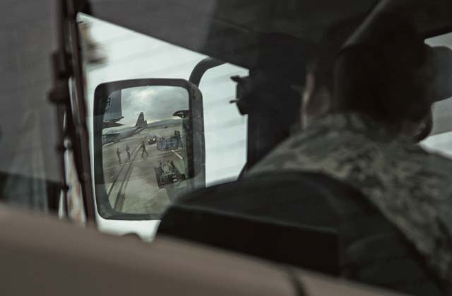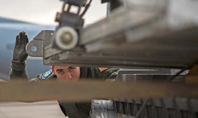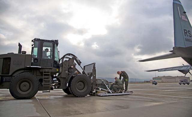Loadmasters from the 37th Airlift Squadron ensure a bundle is properly secured prior to loading it onto a C-130J Super Hercules Jan. 20 on Ramstein. Cargo loaded into an aircraft is carefully inspected by loadmasters and aerial delivery specialists to ensure the safety of the crew. Airman 1st Class Dylan Arnt, 37th Airlift Squadron loadmaster, guides a forklift to place a pallet onto the ramp of a C-130J Super Hercules.Tech Sgt. Megan Johnson, 86th Logistics Readiness Squadron aerial delivery NCO in charge, watches as loadmasters from the 37th Airlift Squadron guide a forklift onto a C-130J.Staff Sgt. Brantley Roberson, 86th Logistics Readiness Squadron aerial delivery supervisor, waits as Airmen prepare a C-130J Super Hercules to take in cargo.Airman 1st Class Dylan Arnt (center), 37th Airlift Squadron loadmaster, directs an Airman as she drives a forklift with cargo onto a C-130J Super Hercules.