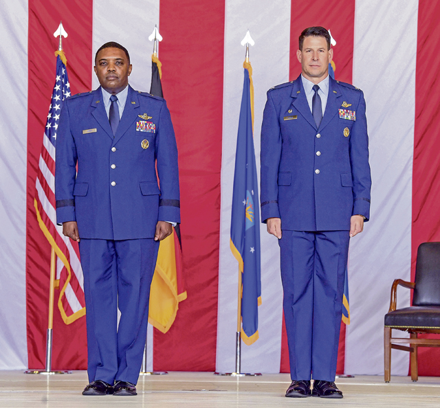 U.S. Air Force Brig. Gen. Otis C. Jones, 86th Airlift Wing commander, left, and Col. Sean Finnan, 86th Operations Group out-going commander, stand at attention during the 86th OG change of command ceremony at Ramstein Air Base, June 15. Finnan relinquished command of the 86th OG to Col. Bret Echard.