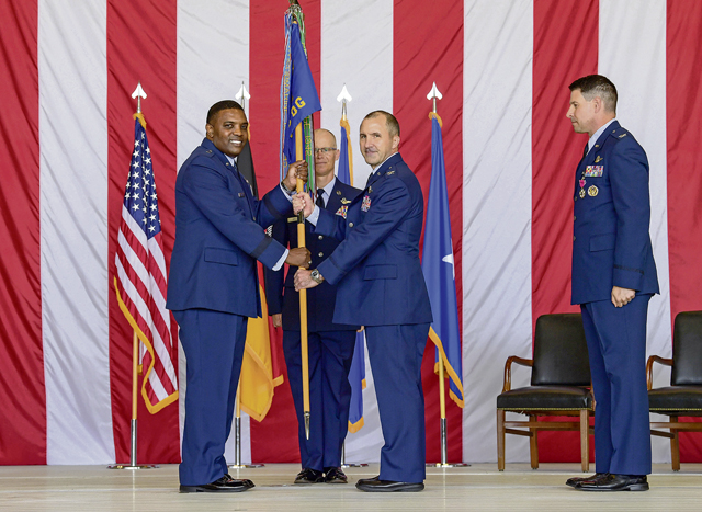 U.S. Air Force Brig. Gen. Otis C. Jones, 86th Airlift Wing commander, left, receives the 86th Operations Group guidon from Col. Sean Finnan, 86th Operations Group out-going commander, middle, during the 86th OG change of command ceremony at Ramstein Air Base, June 15. The operations group consists of 14 C-130J Super Hercules aircraft, five C-21A Learjets aircraft and one C-37A Gulfstream V aircraft.