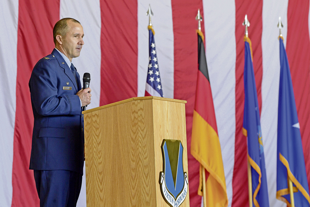 U.S. Air Force Col. Bret Echard, 86th Operations Group in-coming commander, gives a speech after accepting command during the 86th OG change of command ceremony at Ramstein Air Base, June 15. Echard was previously the 41st Airlift Squadron commander at Little Rock Air Force Base, Arkansas.