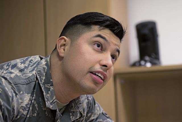 Airman 1st Class Alec Serna, 86th Security Forces Squadron’s Selectively Trained And Ready augmentee, reaches for a training handgun during a simulation at the 86th SFS training facility Nov. 7 on Ramstein Air Base. The simulation tested the STAR augmentees’ ability to assess a quickly escalating situation where they had to decide to use lethal, nonlethal or less than lethal force. STAR augmentees are used on an annual rotation basis.