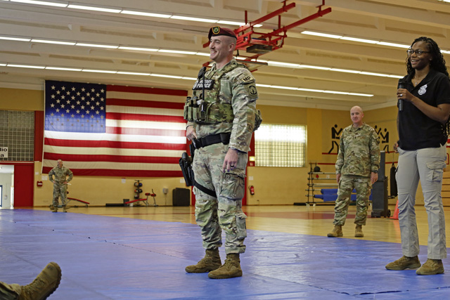 U.S. Army Staff Sgt. Bennett, a military police Soldier assigned to the 108th Military Police Battalion, speaks to Soldiers from the 95th Combat Sustainment Support Battalion during a safety stand-down session at the Hall of Champions Gymnasium, Baumholder, Germany, July 11, 2025. The event educated service members on various safety topics and reinforced readiness across the theater-level sustainment support battalion. (U.S. Army photo by 1st Lt. Nahjier Williams)