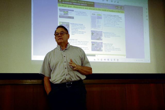 Mr. Tomas Howes, 16th Sustainment Brigade Safety Specialist speaks to Soldiers of the 95th Combat Sustainment Support Battalion during a safety standdown session held at the Wagon wheel Theater located on Baumholder, Germany, on July 31, 2025. During the session, Howes discussed mishaps that he’s witnessed during his long career and explained the criteria and importance of reporting accidents.