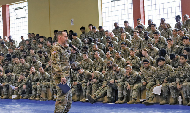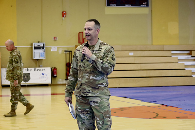 Lt. Col. James J. Seale, Commander 95th Combat Sustainment Support Battalion, speaks to Soldiers of the Herd Battalion during a safety standdown event held at the Hall of Champions Gymnasium located on Baumholder, Germany, on July 11, 2025. The session was held to educate servicemembers on various safety related topics and to ensure a continued state of readiness across battalion which is a theater level sustainment support asset.