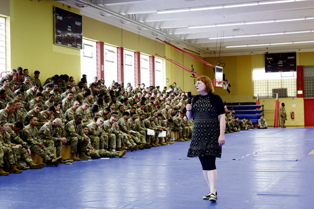 A guest speaker briefs Soldiers of the 95th Combat Sustainment Support Batticon during a safety standdown session held at the Hall of Champions Gymnasium located on Baumholder, Germany, on July 11, 2025. The session was held to educate servicemembers on various safety related topics and to ensure a continued state of readiness across battalion which is a theater level sustainment support asset.