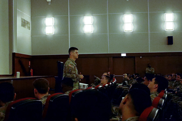 U.S. Army 1st Sgt. Bryan Erwin, HHC, 95th Combat Sustainment Support Battalion, shares a personal life experience with 95th Combat Sustainment Support Battalion Soldiers to encourage situational awareness and prevent complacency. The session held at the Wagon wheel Theater located on Baumholder, Germany, on July 31, 2025. During the session, Howes discussed mishaps that he’s witnessed during his his long career and explained the criteria and importance of reporting accidents