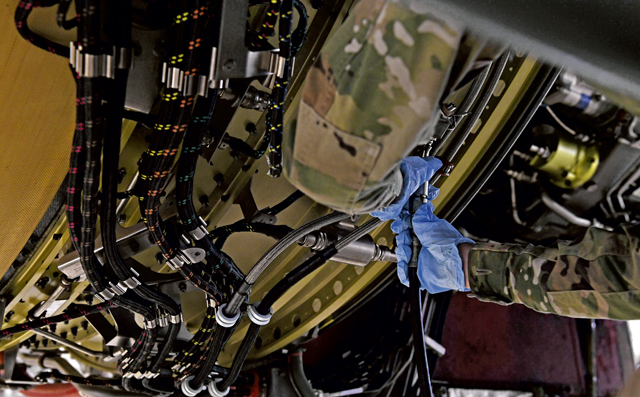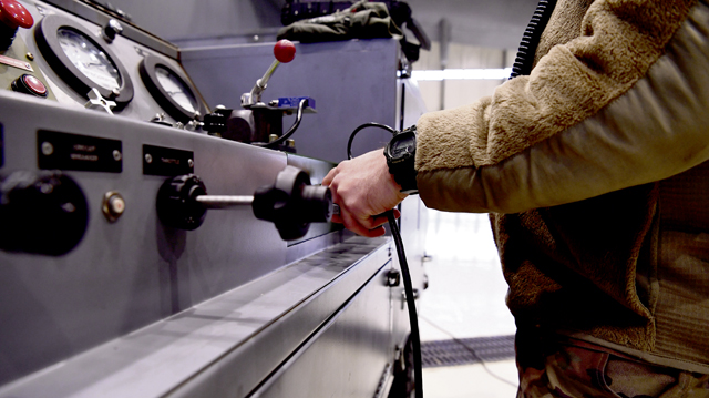 U.S. Air Force Staff Sgt. Giancarolo Cintron, a 521st Air Mobility Operations Wing hydraulics regional training center instructor, uses a hydraulics machine to control the levels of fluid going into the aircraft jacks as they lift the aircraft at Ramstein Air Base, Dec. 11. Airmen from Incirlik AB, Rota AB Spangdahlem AB and Ramstein AB learned fundamental aircraft maintenance skills while attending the training.