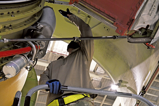 Senior Airman Teyana Jackson, a 725th Air Mobility Squadron aerospace propulsion technician, connects a hose to an aircraft engine at Ramstein Air Base, Dec. 11. Airmen from Incirlik AB, Rota AB, Spangdahlem AB and Ramstein AB attended a training exercise to diversify the aircraft they are able to work on.