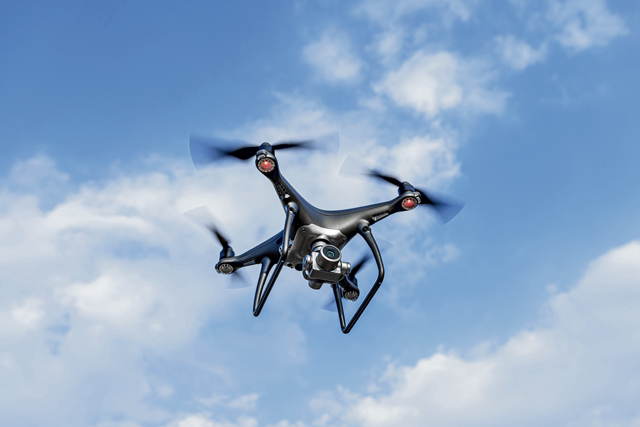 A,Black,Modern,Drone,With,A,Camera,Flies,In,The