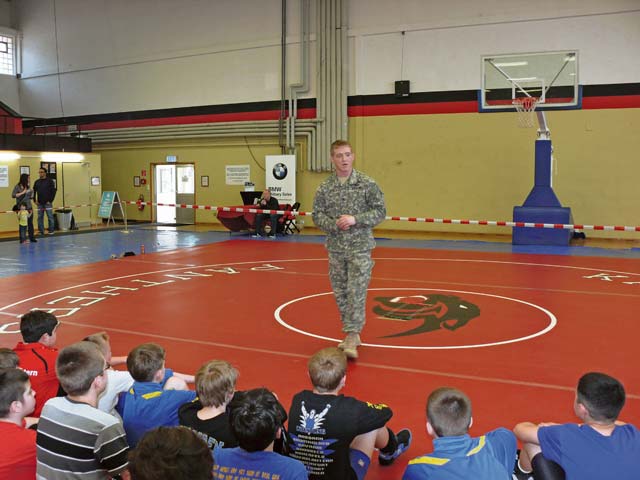 Staff Sgt. Colton Smith speaks with youth wrestlers and their parents after a tournament March 29 at the Miesau Fitness Center. Smith is the only active duty Ultimate Fighting Championship fighter in the world. He is currently stationed at Fort Hood, Texas.