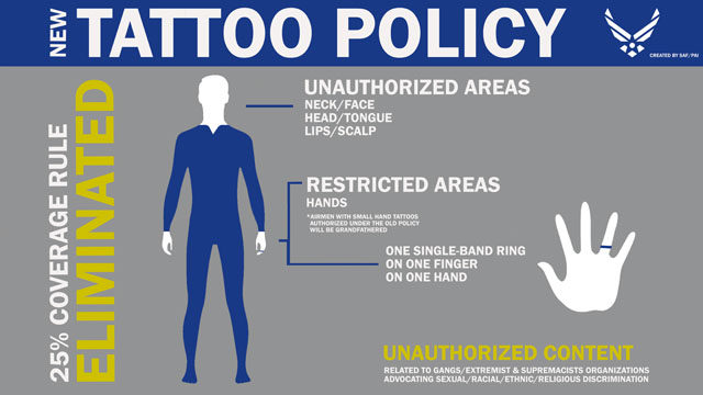 WASHINGTON — The Air Force announced new policies on dress and appearance with regard to tattoos as well as changes to service medical accession policy Jan. 9.
