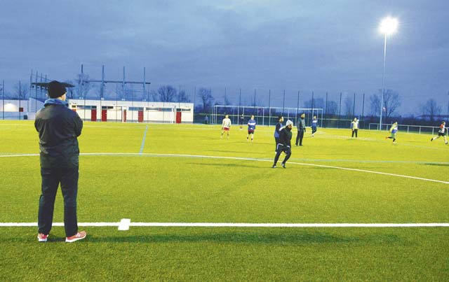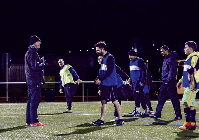 First Lt. Sean Miller, 7th Weather Squadron chief of education and training, watches his soccer team as they begin a practice session March 3 at U.S. Army Garrison Wiesbaden. To assess his team’s strengths and weaknesses, Miller pits his players on opposite teams and plays them against each other to depict an actual game.