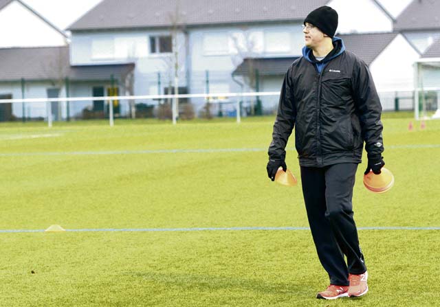 First Lt. Sean Miller, 7th Weather Squadron chief of education and training, prepares a soccer field for a practice session March 3 at U.S. Army Garrison Wiesbaden. Miller, a coach for a local Wiesbaden team, adjusts his practice regiments based on his players’ performances using detailed analyses of their prior games and practices.