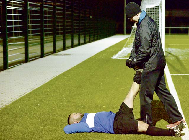 First Lt. Sean Miller, 7th Weather Squadron chief of education and training, helps one of his players stretch during practice March 3 at U.S. Army Garrison Wiesbaden. Miller is the coach of a local soccer team in Wiesbaden and was recently appointed as the Air Force soccer team assistant coach.