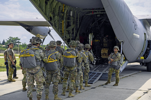U.S. Army soldiers assigned to the 1st Squadron, 91st Cavalry regiment, 173rd infantry brigade combat team (airborne) prepare to board a U.S Air Force C-130J Super Hercules during Agile Spirit 21 at Alekseevka Air Base, Georgia, August 1. U.S. and Georgian personnel tested their interoperability during jumps supported by the 37th Airlift Squadron. Agile Spirit 2021 is a joint, multinational exercise co-led by the Georgian Defense Forces and U.S. Army Europe and Africa.