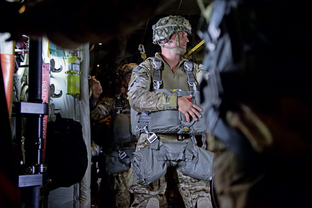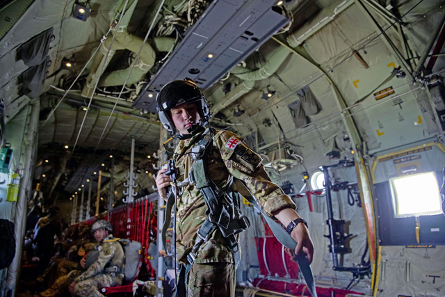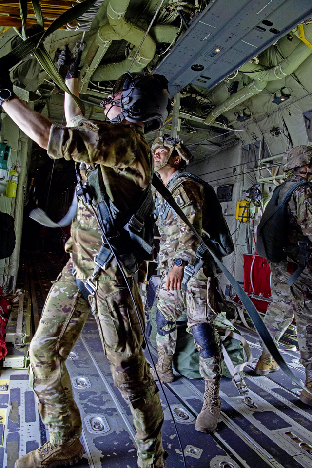 A U.S. Army soldier assigned to the 1st Squadron, 91st Cavalry regiment, 173rd infantry brigade combat team (airborne) waits to jump from a U.S Air Force C-130J Super Hercules during Agile Spirit 21 at Vaziani Air Field, Georgia, August 1. The 37th Airlift Squadron, assigned to Ramstein Air Base, provided support for Georgian and U.S. paratroopers to exercise their capabilities during the exercise. Agile Spirit enhances U.S., Georgian, allied and partner forces’ lethality, interoperability and readiness in a realistic training environment.