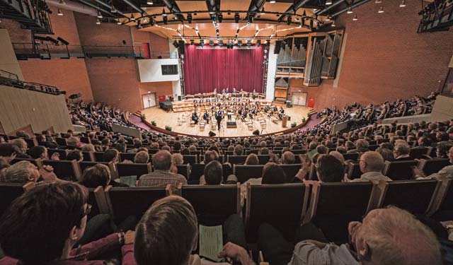 The U.S. Air Forces in Europe Band prepares to deliver a performance inside the Conservatoire de Luxembourg Oct. 9 in Luxembourg City, Luxembourg. Air Force bands support the global Air Force mission by preserving national heritage, providing professional musical products and acting as ambassadors throughout their touring schedules and performances.