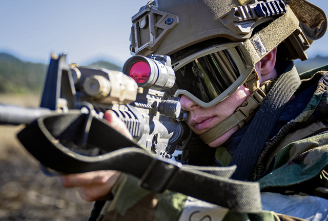 Staff Sgt. Miles Winford, 821st Contingency Response Squadron weather technician, takes aim down his M-4 carbine scope during exercise Strom Crow, at Fort Hunter-Liggett, Calif., June 26, 2024. The 621st Contingency Response Wing inspection team validated and certified the 821st CRS during the exercise on multiple areas of interest, such as base defense and chemical, biological, radiological and nuclear readiness for their upcoming deployment alert cycle this fall. (U.S. Air Force photo by Staff Sgt. Scott Warner)