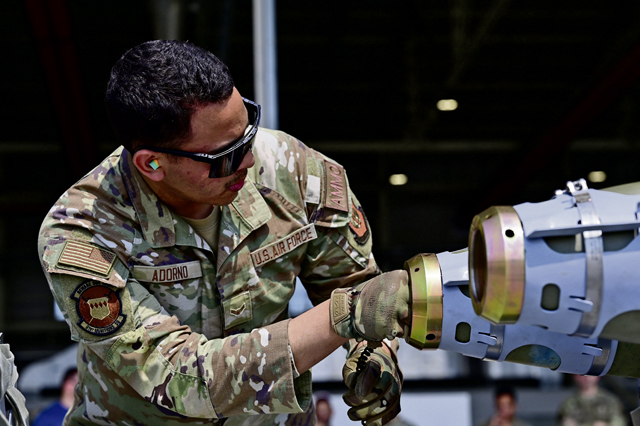 U.S. Air Force Airman 1st Class Anthony Adorno, 31st Munitions Squadron conventional maintenance apprentice, puts together simulated conventional weapons during the quarterly rapid aircraft generation and employment competition at Aviano Air Base, Italy, July 12, 2024. RAGE competitions showcase the wing’s lethal combat capabilities and demonstrate agile combat employment effectiveness. (U.S. Air Force photo by Senior Airman Raya Feltner)