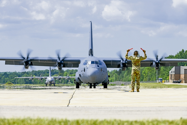 The 910th Airlift Wing’s first C-130J-30 Super Hercules is marshaled to its arrival ceremony, on July 16, 2024, at Youngstown Air Reserve Station, Ohio. The aircraft’s arrival is the first in a three-year conversion from the unit’s current C-130H Hercules fleet to the newer airframe model. (U.S. Air Force photo by Tech. Sgt. Noah J. Tancer)
