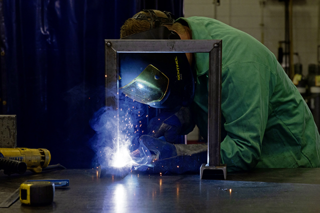 Air National Guard Tech. Sgt. Caleb Joner, an aircraft metals technology specialist with the 162nd Wing, welds metal pieces at Morris Air National Guard Base, Ariz., July 17, 2024. Aircraft metals technology specialists are responsible for repairing and creating essential aircraft parts critical to the function of F-16 Fighting Falcons and the success of the mission. (U.S. Air National Guard photo by Senior Airman Guadalupe Beltran)
