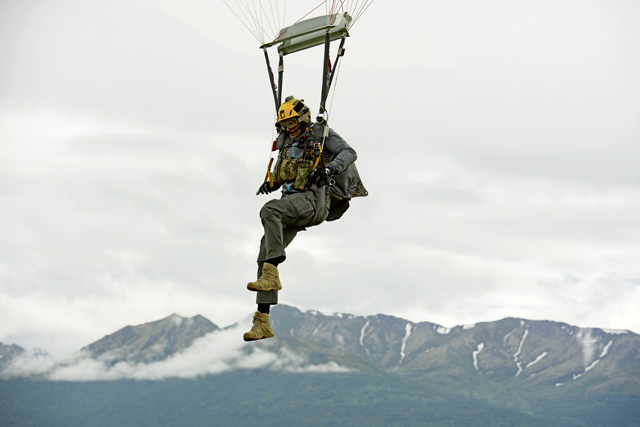 An Alaska Air National Guard pararescueman from the 212th Rescue Squadron lands after conducting airborne operations at Malemute Drop Zone at Joint Base Elmendorf-Richardson, Alaska, July 9, 2024. The Guardsmen of the 212th RQS and the 3rd Air Support Operations Squadron tactical air control party special warfare Airmen conducted joint airborne training to maintain the pararescuemen’s proficiency in conducting full-spectrum personnel recovery to include both conventional and unconventional rescue operations and the TACP’s to direct lethal and nonlethal joint firepower whenever necessary. (U.S. Air Force photo by Nicholas Holland)