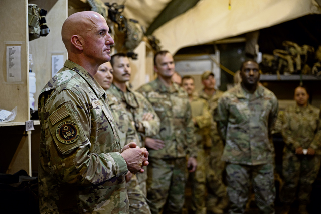 Chief Master Sgt. of the Air Force David Flosi is briefed by Airmen assigned to the 48th Expeditionary Rescue Squadron at an undisclosed location within the U.S. Central Command area of responsibility on July 23, 2024. Flosi toured the installation with the AEW leadership team, attending intel briefs and recognized several Airmen for their accomplishments and contributions to the mission. (U.S. Air Force photo)
