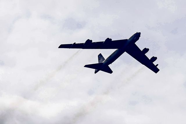 A U.S. Air Force B-52 Stratofortress, assigned to the 2nd Bomb Wing, participates in a flyover at Farnborough International Airshow in Farnborough, United Kingdom, July 24, 2024. FIA is an opportunity for the U.S. military to come together with U.K. and NATO allies and partners to display the dynamic capabilities of various aircraft and highlight collective readiness. (U.S. Air Force photo by Senior Airman Katie Mullikin)