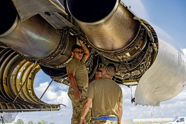 U.S. Air Force maintainers, deployed from Barksdale Air Force Base, La., inspect the inside of an engine cowling on a B-52H Stratofortress at Mihail Kogălniceanu Air Base, Romania, during Bomber Task Force Deployment 24-4, July 22, 2024. Bomber task force missions enable Airmen to maintain a high state of readiness and proficiency, validating the always-ready, global strike capability. (U.S. Air Force Photo by Senior Airman Seth Watson)
