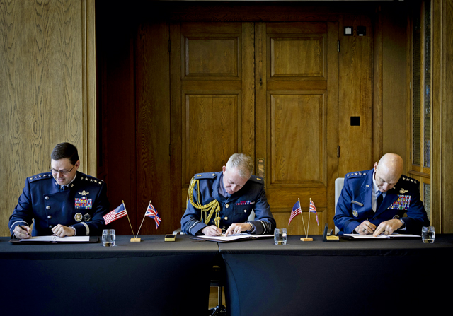 U.S. Space Force Chief of Space Operations Gen. Chance Saltzman, Royal Air Force Chief of the Air Staff Air Chief Marshal Sir Rich Knighton, and U.S. Air Force Chief of Staff Gen. David Allvin sign a Shared Vision Statement on combined air and space power in the 21st century at the RAF’s Global Air and Space Chiefs’ Conference in London, July 17, 2024. As the NATO alliance celebrates its 75th anniversary, this shared vision exemplifies U.S. efforts to work with NATO allies and European partners to adapt and modernize its approach to challenges in an era of Great Power Competition (Courtesy photo by Royal Air Force Cpl. Sarah Barsby).
