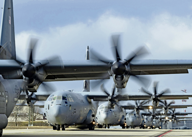 Six U.S. Air Force C-130J Super Hercules from the 86th Airlift Wing taxi down the flightline at Ramstein Air Base, Germany, Feb. 13, 2024. The 86th AW flexed its ability to defend U.S. interests and project power in the European theater by launching the aircraft carrying over 200 joint paratroopers from the U.S. Army, U.S. Air Force, and German army within a short notice. (U.S. Air Force photo by Senior Airman Andrew Bertain)