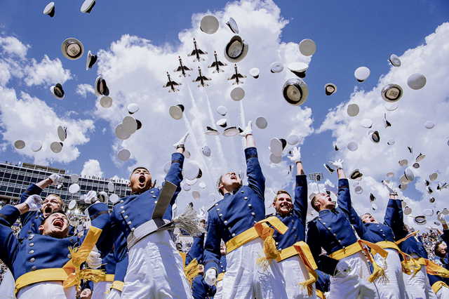 The U.S. Air Force Academy Class of 2024 graduates toss their hats skyward as the U.S. Air Force Air Demonstration Squadron “Thunderbirds” roar overhead at the Academy’s Falcon Stadium in Colorado Springs, Colo., May 30, 2024. Nine-hundred-seventy-four cadets crossed the stage to become the Air Force and Space Force’s newest second lieutenants. (U.S. Air Force photo by Dylan Smith)