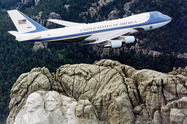 Air Force One flies over Mount Rushmore, S.D., June 12, 2024. The mission of Air Force One is to provide air transport for the president of the United States. The presidential air transport fleet consists of two specially configured Boeing 747-200B’s, tail numbers 28000 and 29000, with the Air Force designation VC-25. When the president is aboard either aircraft, or any Air Force aircraft, the radio call sign is Air Force One. (U.S. Navy photo by Seaman Connor Engelmann)
