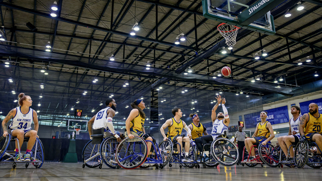 Athletes with team Air Force and team Navy compete in a wheelchair basketball game during the 2024 Department of Defense Warrior Games at the ESPN Wide World of Sports Complex in Orlando, Fla., June 25, 2024. The Warrior Games are designed to enhance the recovery journeys of wounded, ill or injured service members and veterans outside of traditional therapy settings, bringing the community together for recovery in real time. (U.S. Air Force photo by Senior Airman Lauren Cobin)
