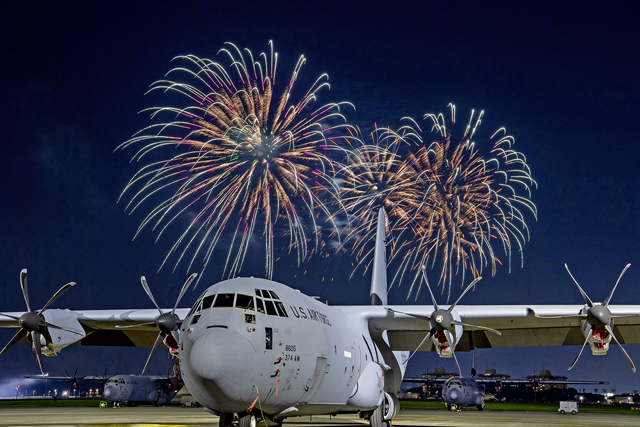 Fireworks explode behind a C-130J Super Hercules assigned to the 36th Airlift Squadron during Celebrate America at Yokota Air Base, Japan, July 4, 2024. Celebrate America is an annual event providing military members and their families the opportunity to enjoy games, food and live bands before culminating in fireworks display over the Yokota AB airfield to celebrate Independence Day. (U.S. Air Force photo by Yasuo Osakabe)