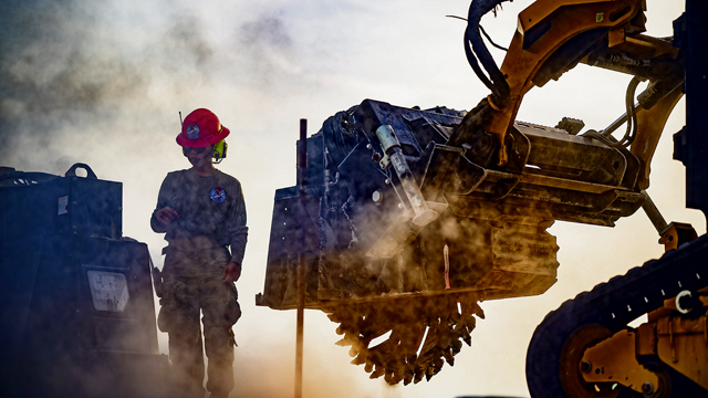 Staff Sgt. Iane Gallardo, 801st Rapid Engineer Deployable Heavy Operational Repair Squadron Engineers Training Squadron pest management cadre, observes a compact track loader during a Rapid Airfield Damage Recovery training exercise at Tyndall Air Force Base, Fla., July 31, 2024. The training exercise involved Airmen assessing damage, clearing debris and repairing the runway with an eight-hour time limit. (U.S. Air Force photo by Airman 1st Class Zeeshan Naeem)
