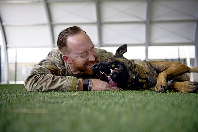 Tech. Sgt. Cullen Thomas, 325th Security Forces Squadron military working dog trainer, interacts with MWD Linez, on the obedience yard at Tyndall Air Force Base, Fla., Nov. 18, 2024. As a MWD trainer, it is important to interact with the K-9s in a close setting to build trust between the two partners. (U.S. Air Force photo by Airman First Class Asha Wiltshire)