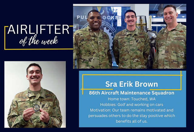 This graphic was created for the Airlifter of the Week, Senior Airman Erik Brown, 86th Aircraft Maintenance Squadron crew chief, at Ramstein Air Base, Germany, Jan. 31, 2024. Brown was awarded AOTW for ensuring his junior Airmen were trained and qualified on all their upgrade training tasks and mentored 5 Airmen on his shift that earned their 5 skill levels. (U.S. Air Force graphic by Airman 1st Class Olivia Sampson)