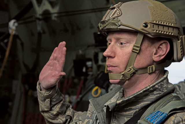 Before stepping off the C-130J Super Hercules, Master Sgt. James Burke, 435th Contingency Response Group airfield manager, re-enlisted in the Air Force on April 8 while over Powidz Air Base, Poland.