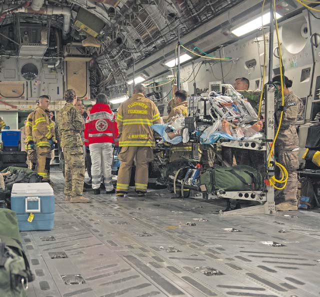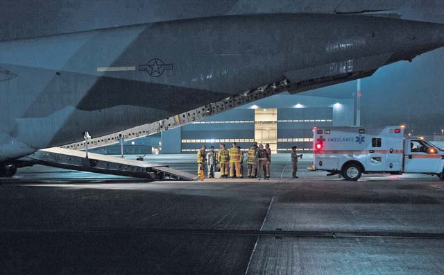 Firefighters from the 86th Civil Engineer Squadron KMC Fire Emergency Services stand by after transporting a wounded warrior from a C-17 Globemaster III to an ambulance Aug. 9 on Ramstein.