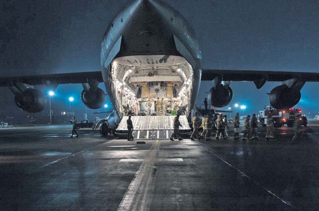 Firefighters from the 86th Civil Engineer Squadron KMC Fire Emergency Services depart a C-17 Globemaster III after assisting in transporting patients from an aeromedical evacuation mission Aug. 9 on Ramstein. The team of firefighters helped to transport medical patients after they arrived on Ramstein from a several-hour flight from Afghanistan.