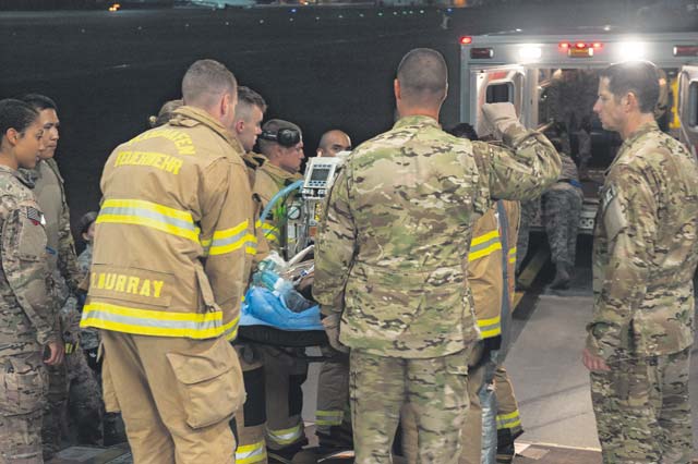 Firefighters and medical personnel transport a wounded warrior from a C-17 Globemaster III to an ambulance Aug. 9 on Ramstein. Personnel from the 86th Civil Engineer Squadron KMC Fire Emergency Services, the 10th Aeromedical Evacuation Operations Team and the 455th Critical Care Air Transport Team Ramstein assisted with the aeromedical evacuation out of Afghanistan.