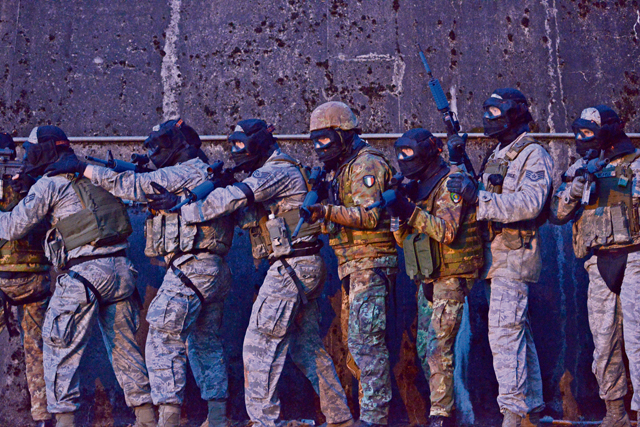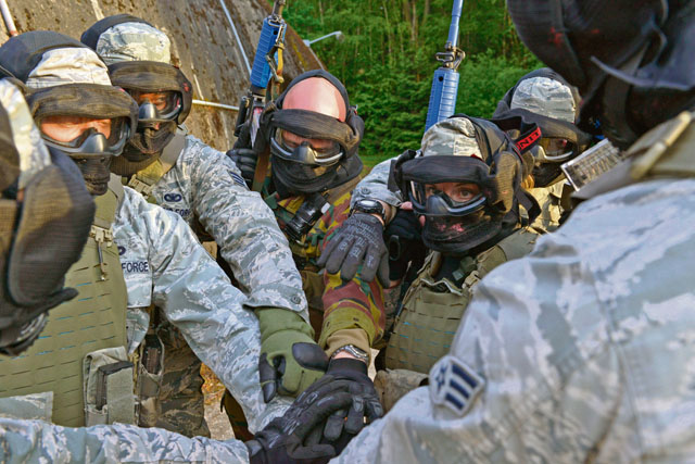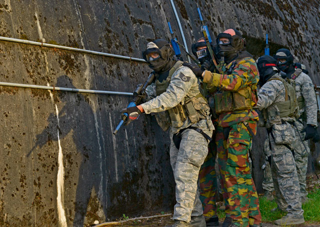 A group of U.S. Airmen and German soldiers take position beside a training hangar awaiting orders to breach. The training includes advanced tactics and sets standard fighting techniques among allied countries.