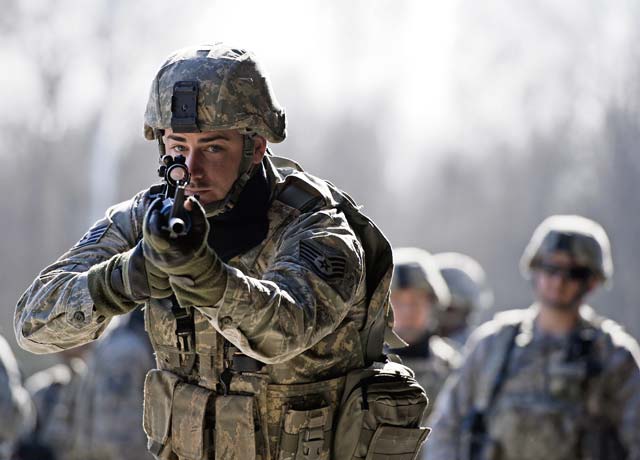 Staff Sgt. Richard Phillips, 703rd Munitions Support Squadron custody force member, assaults a complex during the Battlefield Leaders Assaulter Course, Integrated Combat Essentials, March 11 on Ramstein.