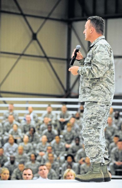 Brig. Gen. Patrick X. Mordente, 86th Airlift Wing commander, speaks to Airmen of the 86th AW Tuesday on Ramstein.